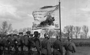 Diviziona karavīri Latgales frontē pie 1.diviziona standarta, 1920.gada vasara.