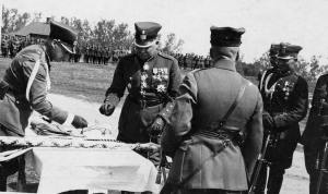 Valsts prezidents Jānis Čakste pasniedz Kara skolai karogu, Rīga, 1923.gada 1.decembris.