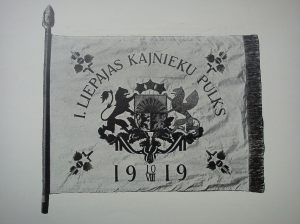 1919.gada 27.martā, pulks izgāja uz fronti un šajā pašā dienā, pirms došanās uz fronti, pulks saņēma Tērbatā dzīvojošo latviešu dāvāto karogu, nacionālās krāsās ar uzlecošu sauli vidū un ar iniciāļiem “1.L.W.K.P.”. Pie jaunā karoga viss pulks nodeva uzticības zvērestu, kura tekstu izstrādāja pulka komandieris ar štābu.
