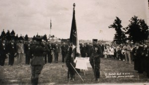 1934.gads, LR kara ministrs ģenerālis Jānis Balodis piestiprina karoga kātam piemiņas zīmi, viņam pretī stāv pulka komandieris pulkvedis Nikolajs Dūze, trešais no kreisās puses ir Ministru prezidents Kārlis Ulmanis un pirmais no labās puses ir Zemgales divīzijas komandieris ģenerālis Rūdolfs Bangerskis.
